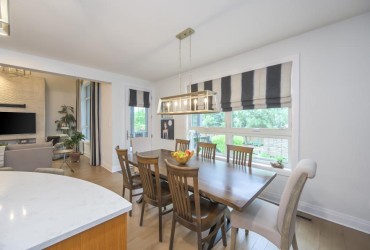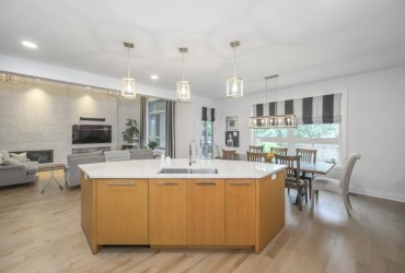 2250 sq. ft. of bespoke design wrapped in natural stone, warm woods, and thoughtful contemporary detailing. From the moment you step inside, the single-storey layout unfolds with clean lines, layered textures, and intentional flow. The great room is anchored by a 15-ft vaulted ceiling and a striking porcelain media wall with an integrated linear fireplace. Quarter-sawn hardwood runs throughout the main living spaces, grounding the palette in warmth and texture. In the kitchen, ceiling-height cabinetry blends soft grey flat panels with the combed grain of Rift-sawn White Oak. Quartz surfaces, integrated appliances, a sculptural 6-seat curved island, and hidden pantry access all contribute to a space that's both functional and refined. The adjacent dining area leads to a Muskoka room that invites relaxed indoor-outdoor living. The primary suite features oversized six-pane windows that draw in natural light. A spa-style 5-piece ensuite enjoys double sinks, triple vanities, heated floors & a deep soaker tub wrapped in textured porcelain that continues across the wall to envelope the curb-less, seated, glass shower. Two additional bedrooms include generous closets and share a beautifully finished main bath. The powder room introduces a tactile design moment with its organic cork wall treatment. A custom switchback staircase wood-framed and glass-paneled leads to the finished lower level where lookout windows bring in plenty of natural light. 1,656 sq. ft. of additional living space includes a central games room, inviting family room, office with private outdoor entry (ideal for a home business), guest bedroom, gym/flex space, and a 2-piece bath pre-framed and plumbed for shower option. Outside, the backyard is framed by mature trees and offers multiple areas for dining, lounging, and quiet retreat created through designer hardscaping. Set in the Meadowlands of Sunningdale, close to golf, forested trails, shopping, Western University, and University Hospital.